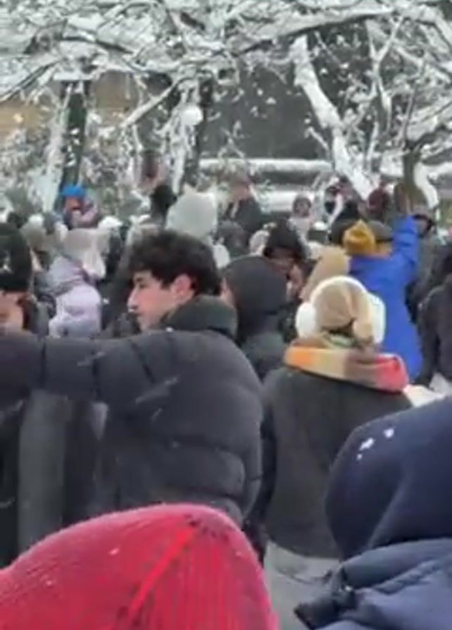 A video captures a dense crowd of people participating in a snowball fight in Washington Square Park, which is blanketed with snow
