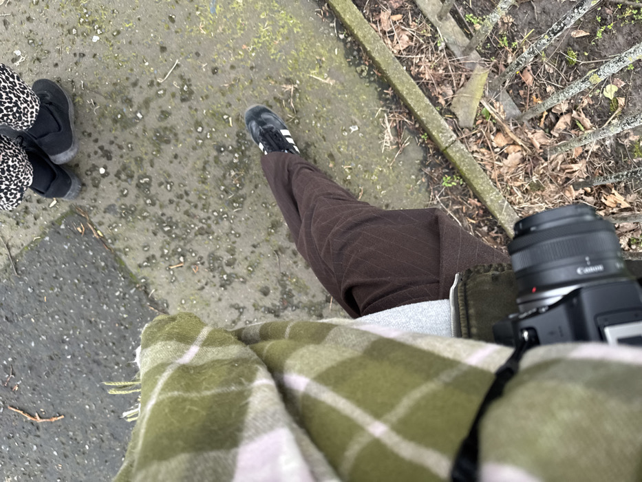 An overhead view captures two individuals standing on a damp, grey concrete or asphalt pavement in the city of Belfast, United Kingdom. In the foreground and midground, one individual, the presumed photographer, is partially visible. They are wearing a light grey top under a dark brown garment, with a green and light-toned plaid scarf draped over their left side. Their right leg is extended, clad in dark brown, possibly pinstriped, trousers with cuffed hems and a black Adidas sneaker featuring three white stripes. A black Canon camera with a visible lens is held in the bottom left, pointed downwards. To the top right, the lower legs and feet of a second individual are visible; this person wears black and white leopard print leggings and black, flat-soled shoes. The pavement surface is speckled with small stones, dirt, and patches of moss. A darker strip, possibly a gutter or road edge, runs along the far left. To the right, a low curb separates the pavement from a narrow strip of soil covered with dry leaves and sparse green vegetation. A metal grate structure is partially visible in the bottom right corner of the frame.