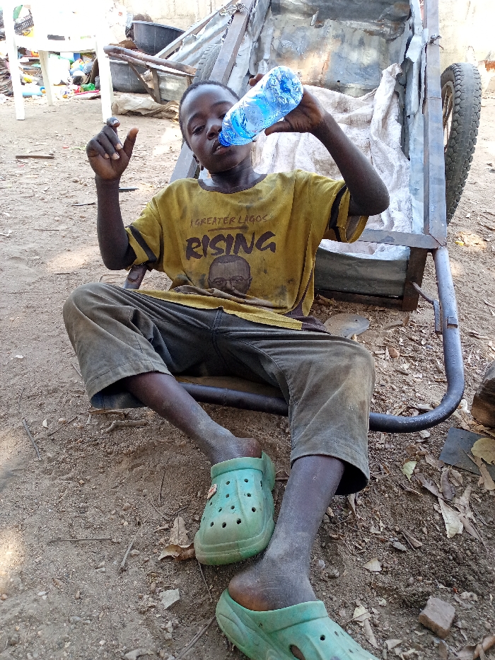 An individual, appearing to be a young male, is seated on a low, dark metal frame in an outdoor setting within Zango-ndaji, Nigeria. He is observed consuming liquid from a clear blue plastic water bottle, held to his mouth with both hands, and looking directly at the camera. He wears a faded yellow short-sleeved t-shirt with the text "I GREATER LAGOS RISING" and an image of a man printed on the front, along with dirty, knee-length brown trousers. His feet, covered in dust, are shod in light green plastic clogs, with the left clog partially slipped off. The ground consists of dry, light brown soil with scattered small stones and dry leaves. In the background, to the left, a white plastic chair is visible amongst miscellaneous debris and metallic structures, including a larger, partially disassembled wheeled cart or wheelbarrow behind the individual.