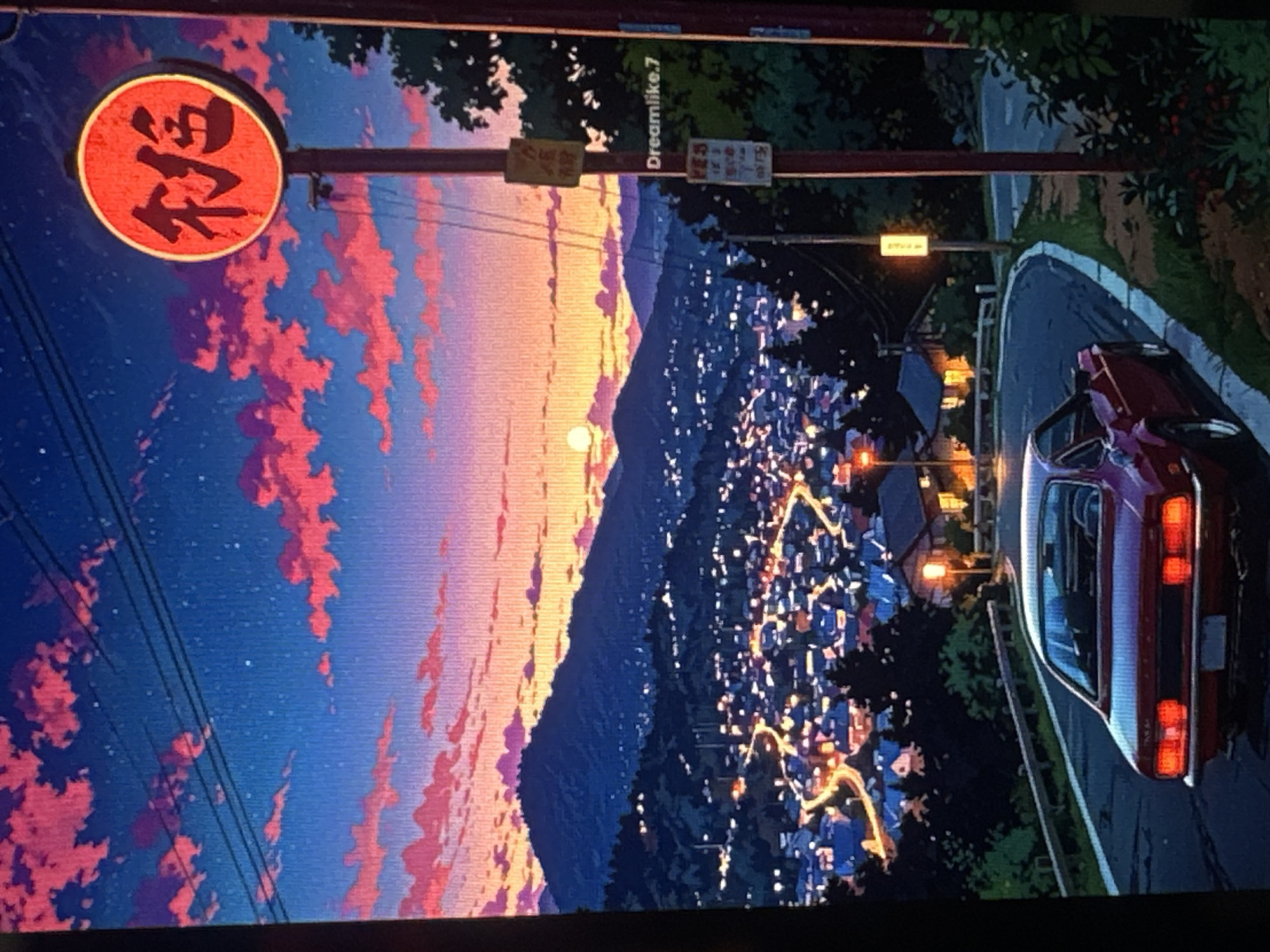The image displays an illustrated urban landscape at dusk or dawn, viewed from an elevated vantage point. The sky transitions from a deep blue, dotted with faint stars and crossed by dark utility wires, to vibrant orange and pink cumulus clouds near the horizon. A bright celestial body, either the sun or moon, is visible low on the horizon above distant, dark green mountains. Below the mountains, a sprawling town or city illuminates the valley with numerous golden lights from buildings and a distinctive serpentine road. In the foreground, a dark red, vintage-style two-door coupe with illuminated taillights is positioned on the right side of a winding paved road, facing away from the viewer. A metal guardrail runs along the left edge of the road. To the right of the road, a utility pole stands prominently, supporting a large, circular, red illuminated sign adorned with dark, stylized Japanese characters. Several smaller rectangular signs are also attached to this pole, one bearing the text "Dreamlike.7". Lush green foliage, including trees and bushes, lines the roadside and is interspersed throughout the urban area and mountains. A single building with illuminated windows and a porch light is visible just beyond the road curve. No individuals are present, and no active interactions are depicted. This scene is set in Budapest, Hungary.