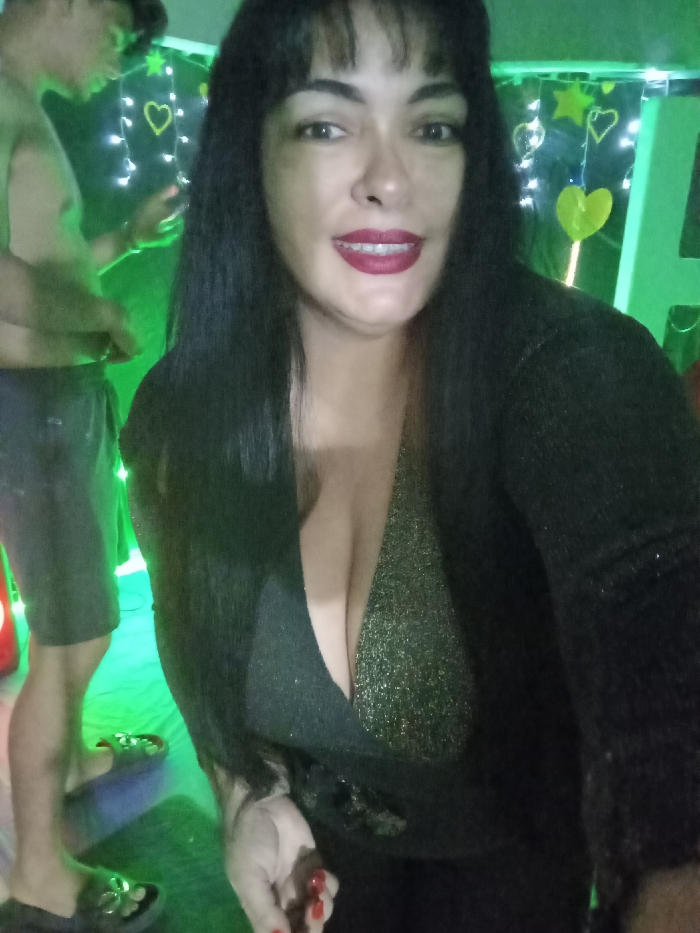 An indoor scene in Juan Griego, Venezuela, features two individuals in a dimly lit, green-hued environment adorned with white string lights shaped as hearts and stars. A female, approximately 30-40 years old, with long dark hair and bangs, dark eyes, and red lipstick, dominates the foreground. She wears a dark, possibly black, long-sleeved top over a low-cut, dark, glittery top, exposing significant cleavage. Her fingernails are painted red, and her left hand holds a small, dark object near her waist. She is smiling directly at the camera. In the left background, a male, appearing to be a young adult, is partially visible. He is shirtless, wearing dark shorts and dark sandals, and has his right arm raised, seemingly interacting with the string lights or background decorations. The overall setting suggests a casual social gathering.