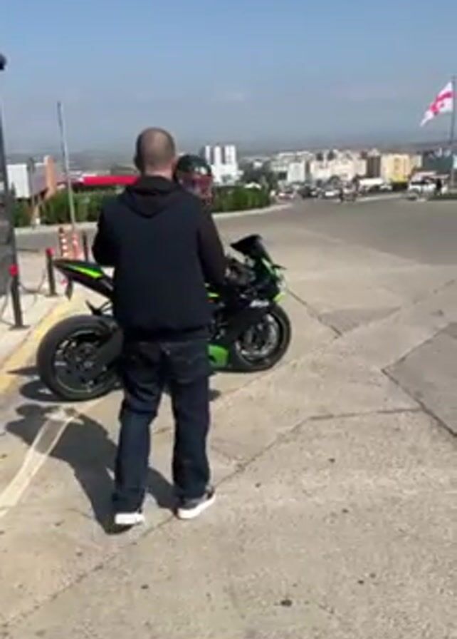 A man wearing a black zip-up hoodie, dark blue jeans, and beige sneakers stands beside a black and green Kawasaki motorcycle at a gas station or rest stop. In the background is a cityscape and a Georgia flag on a pole. The man helps someone in a red jacket and white pants get on the motorcycle. The person getting on the motorcycle is wearing a black helmet. The man in the hoodie then takes a few steps back and bends down, as if taking a photo of the motorcycle and its rider.