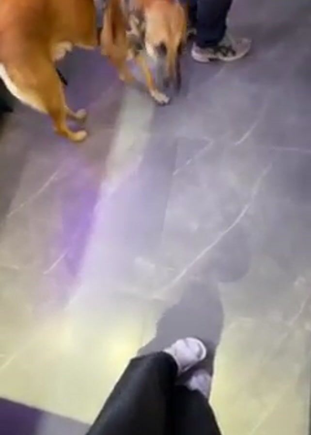 A person wearing black pants and white sneakers is standing on a gray, marbled floor. A medium-sized, tan dog wearing a gray harness walks towards the person and sniffs at their hands. The person reaches out and pets the dog's back. A second person in gray pants and gray and white sneakers is standing nearby. The dog's tail is wagging.