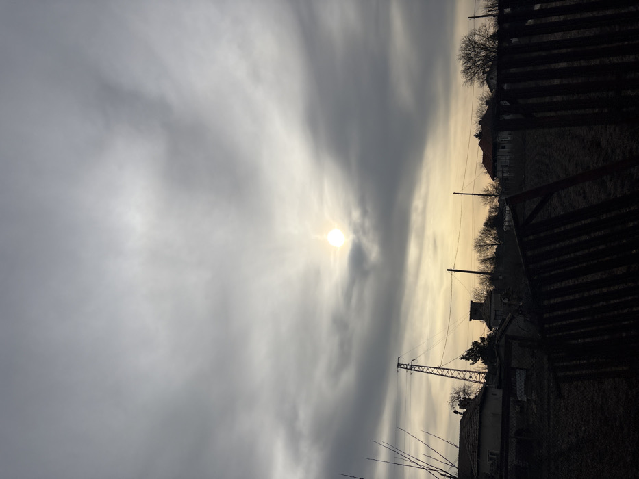 The image depicts a rural or semi-rural landscape in Stefan Karadja, Bulgaria, under an overcast sky. The sun, a bright diffuse orb, is visible through a break in the dark grey and white cloud cover, positioned slightly left of the upper-middle of the frame. The horizon features a band of lighter, yellowish light. In the foreground, a dark, weathered wooden fence with vertical slats is partially visible on the right, appearing to enclose an uncultivated field of dark soil. In the midground, from left to right, elements include the partial view of a house with a tiled roof, several bare tree branches, and a tall metal lattice power line tower leaning slightly. Multiple utility poles with overhead wires extend horizontally across the midground. Further back, another building with a dark roof and a prominent chimney-like structure is visible, alongside scattered bare deciduous trees. On the far right, distant houses with red-tiled roofs are discernible amongst the trees. No people, specific actions, or interactions are visible within the scene. The lighting suggests late afternoon or early morning, with elements in the foreground and midground appearing in silhouette due to the backlight from the low sun.