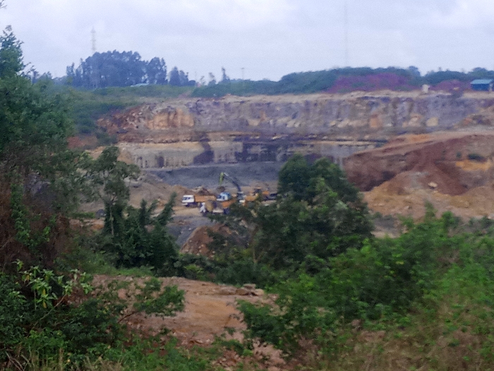 A large excavation pit is visible, revealing layers of rock and soil. Heavy machinery including trucks and excavators are working at the bottom of the pit. Lush green vegetation surrounds the edges of the site, partly obscuring the view. A communications tower is faintly visible in the background amidst trees. The sky is overcast, creating diffused lighting.