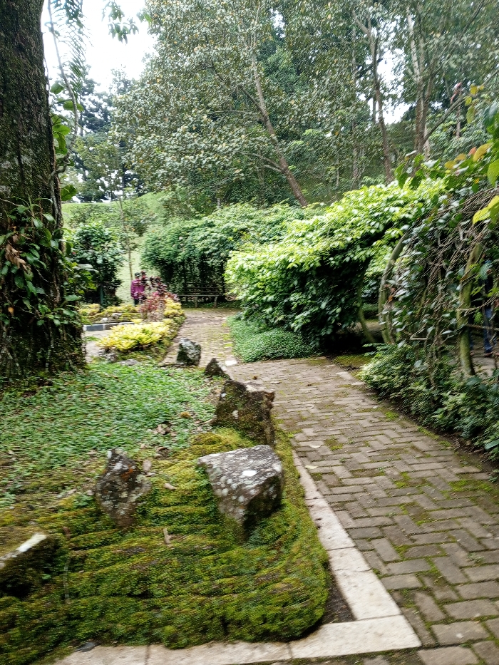 A brick pathway curves through a verdant garden scene. Lush green moss covers rocks bordering the path, leading the eye towards dense shrubbery and trees. Light filters through the foliage, illuminating a bench in the distance. People stand near the bench, enjoying the tranquil setting. A large tree trunk dominates the left foreground, adding depth and a sense of groundedness to the serene landscape.