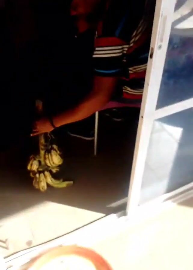 A man wearing a striped shirt, jeans, and a baseball cap sits on a purple chair inside an enclosed porch area. He is holding a tablet. A stem of bananas lies on the floor in front of him. He is reaching towards the bananas. A white frame surrounds the opening to the porch. The porch is dimly lit, and there is a bright area outside. Other people are partially visible in the background. A red plate sits outside the frame.