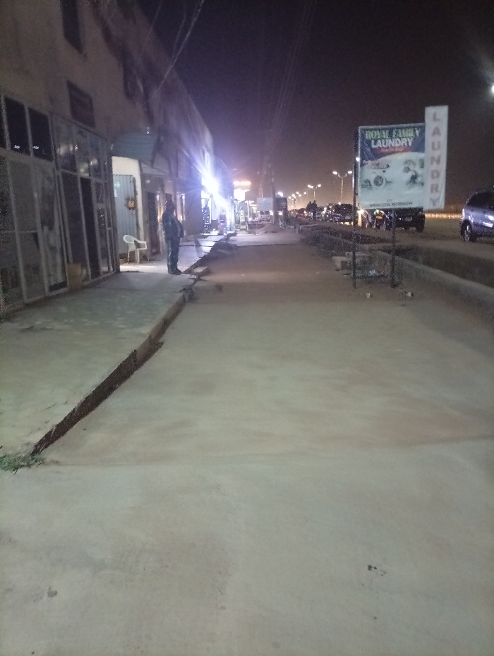 At night, a street scene features a wide sidewalk alongside a road with sparse traffic. Buildings line the left side of the image, exhibiting closed storefronts. A person stands near the buildings, observing the scene. A large sign advertising "Royal Family Laundry" is prominently displayed. Overhead wires crisscross the sky, illuminated by streetlights. The pavement is cracked and uneven, while the overall lighting casts long shadows.