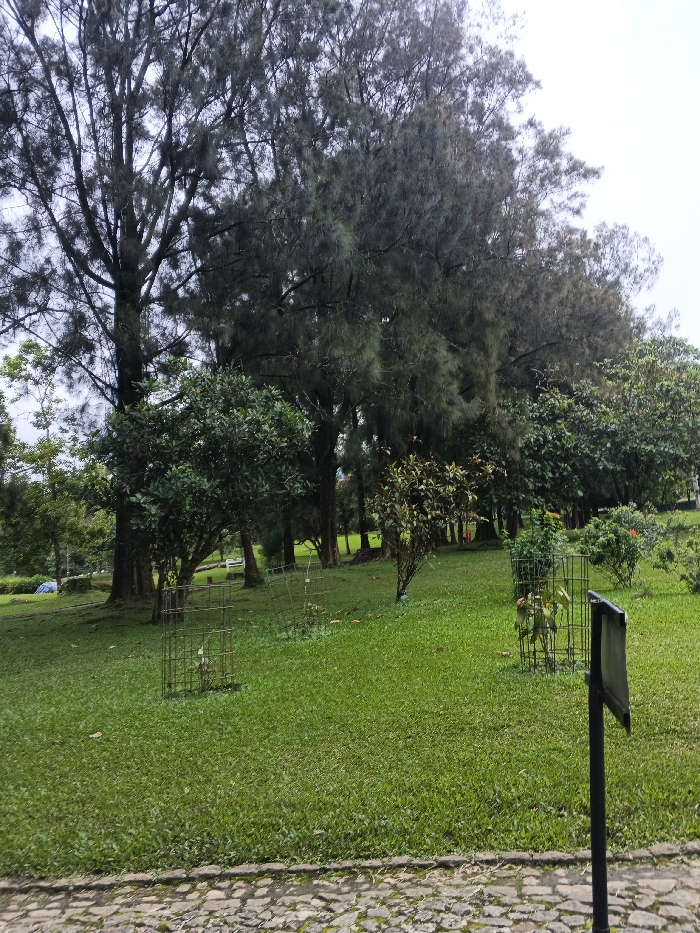 Lush green lawn bordered by large trees, predominantly evergreens, under an overcast sky. Several young trees are protected by wire cages. In the foreground, a portion of a stone-paved area is visible. A sign on a metal post stands in the bottom right corner. The scene suggests a park or garden setting.