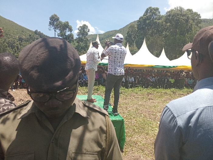This image depicts an outdoor public gathering in Manda-Shivanga ward, Kenya, characterized by a clear sky and a backdrop of lush green forested hills