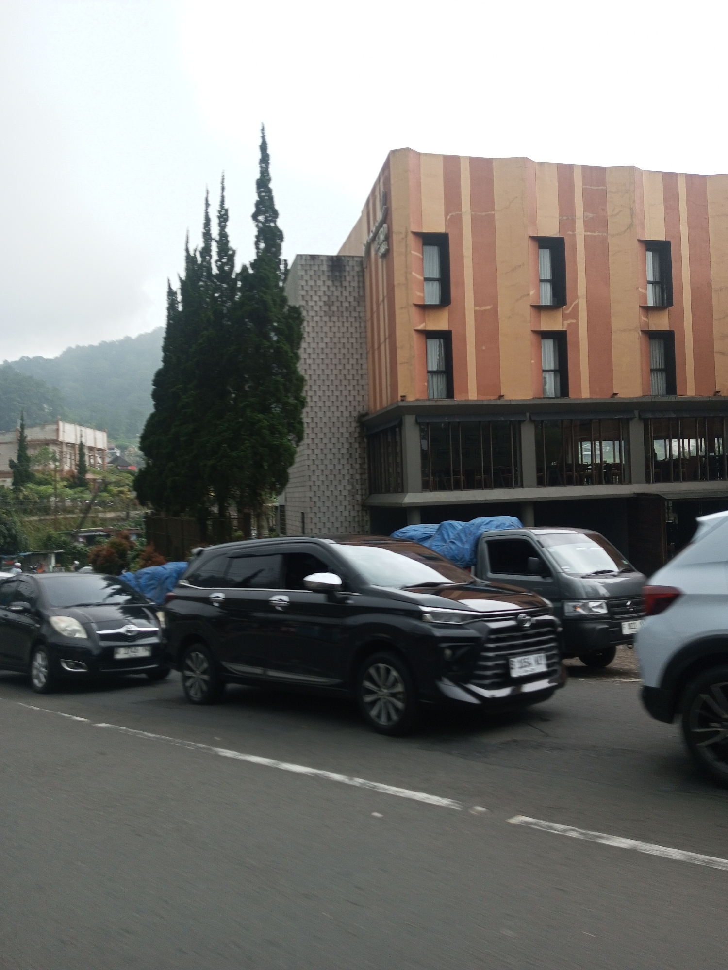 street scene with several cars in front of a building. The building has a modern architectural style, with alternating vertical stripes of orange and beige. It has a large glass-enclosed ground floor. Tall cypress trees stand near the building. Behind the building, mountains are visible. The cars are a mix of makes and models, including a black hatchback, a dark SUV, a small truck with a blue tarp, and a white SUV. The scene takes place on a cloudy day. Based on the license plates on the car and the surrounding landscape, the scene is in the vicinity of Mae Chan District, Thailand.