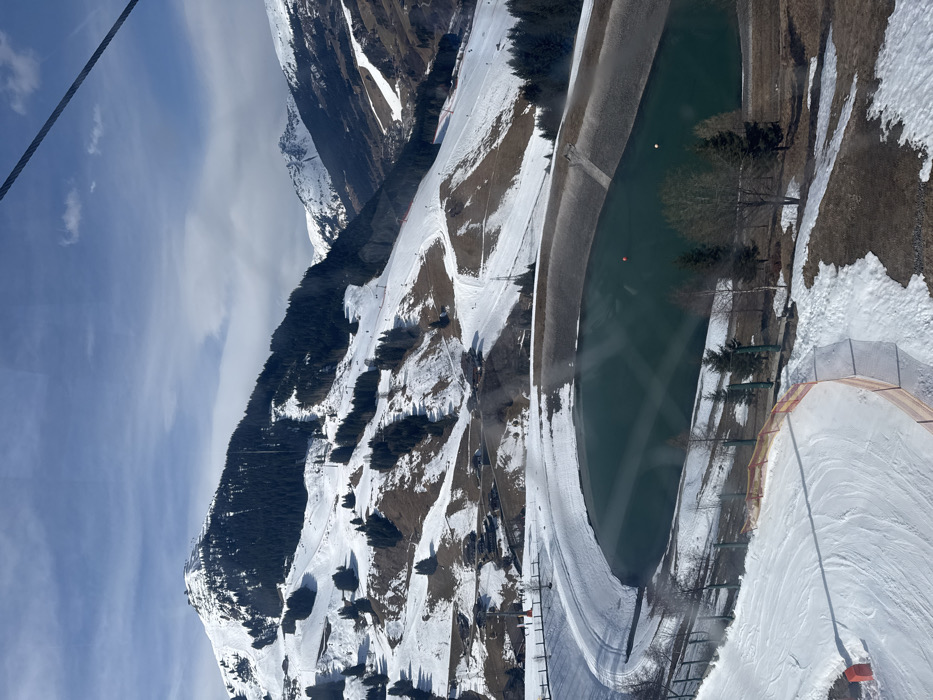 The image provides an elevated view of a winter mountain landscape in Saalbach-Hinterglemm, Austria. A large, dark green artificial reservoir, featuring a visible retaining wall and two small orange buoys on its surface, dominates the mid-ground. Surrounding the reservoir are sections of snow, exposed brown earth, and scattered evergreen and bare deciduous trees. In the foreground, a groomed, snow-covered ski path with orange safety netting is visible. The background consists of extensive snow-covered mountainsides, densely forested areas, and numerous groomed ski trails. Multiple ski lift towers are observable across the slopes, alongside several scattered buildings. The sky is partly cloudy blue. No individuals are depicted within the scene.