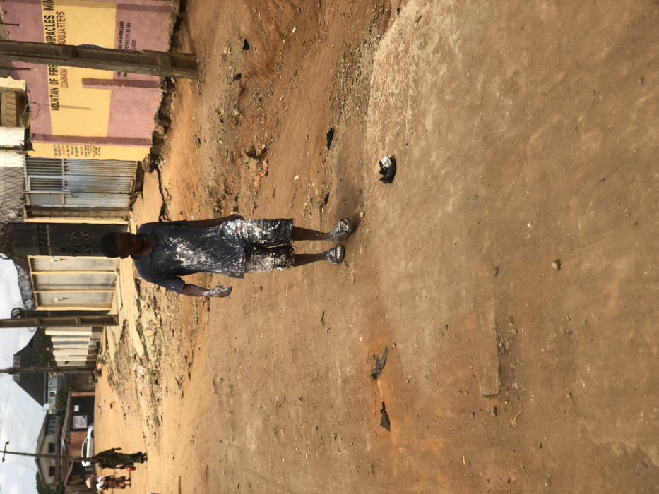 The scene depicts a reddish-brown dirt road in Egan, Nigeria, under an overcast sky