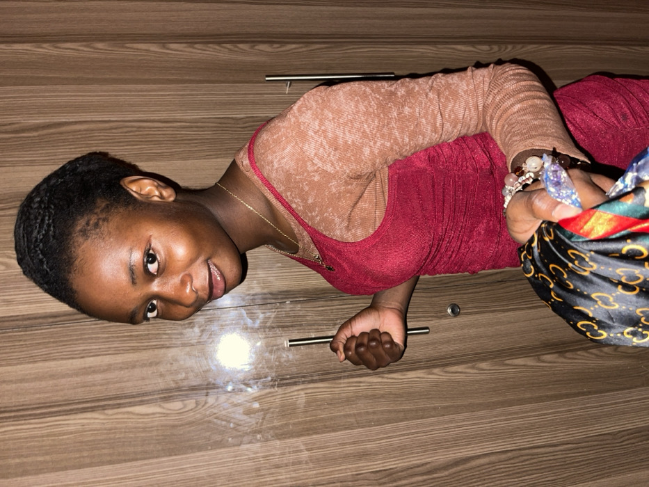 The scene is located in Chikaji, Nigeria. A female subject stands indoors, positioned in front of a light brown wooden wardrobe featuring vertical grain patterns. The subject has dark skin and dark hair styled upwards from the forehead, displaying texture consistent with braids or twists. She wears a sleeveless, ruched red dress or top layered over a translucent, long-sleeved, light brown undershirt. A thin gold chain with a small pendant is visible around her neck. Her left hand firmly grasps a slender, vertical metallic handle on the wardrobe door. A circular lock mechanism is present below the handle, and a distinct circular light reflection is visible on the wardrobe panel to the left of the handle. Her right hand holds several items: a black fabric piece with repeating gold "CC" or similar logos, multiple colorful fabric strips, and several bracelets adorn her wrist. Her fingernails are long and decorated with a patterned design. The subject faces the viewer, displaying a slight smile.