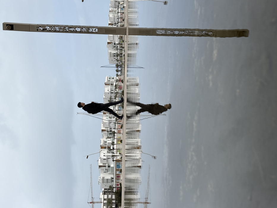 The image depicts an urban waterfront scene in Tangier, Morocco, under an overcast sky. A large, still puddle of water occupies the lower half of the frame, creating clear reflections. A male individual, dressed in a black hoodie, dark trousers, and dark athletic shoes, walks from left to right across a paved surface bordering the puddle, carrying a backpack. His full reflection is visible in the water directly beneath him. To the right, a tall, rectangular, dark-colored pillar, featuring a series of intricate geometric cut-out patterns, stands partially within the frame, with its reflection also visible in the water. In the background, a line of modern, multi-story white buildings with numerous windows and balconies extends horizontally, interspersed with palm trees. A large red and white construction crane is visible on the far left, behind the buildings, indicating ongoing development. The sky is a uniform light grey with minimal cloud definition.