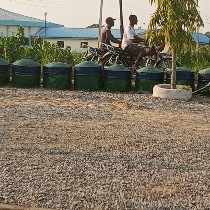 This image depicts an outdoor scene in Koko, Nigeria, captured during daylight. The foreground consists of a light brown and grey gravel surface. Spanning the middle ground is a linear arrangement of at least seven uniform, barrel-like objects, each painted dark green with a dark blue band around its upper perimeter. To the right of this line of barrels, a small tree with green leaves grows from a circular, light-colored concrete planter. In the background, two male individuals are observed riding a motorcycle from right to left. The driver wears a light-colored short-sleeved shirt and dark trousers. The passenger, seated behind the driver, is shirtless, wears dark trousers, and a dark baseball cap. The motorcycle is dark with metallic accents. Behind the individuals and barrels, a dense line of green foliage is visible. Further in the distance, a light-colored building with a distinctive light blue gabled roof is partially obscured by vegetation. Utility poles are present, extending vertically against a hazy, light-colored sky.