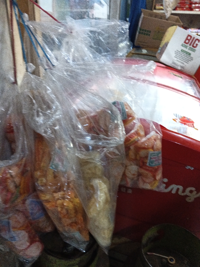 This image depicts the interior of a commercial establishment, likely a small shop or market stall, located in Pinnwe, Myanmar. The foreground is dominated by multiple large, clear plastic bags suspended vertically. These bags contain various granular or chunky food items, appearing to be snacks such as fried crackers or crisps, characterized by orange, yellow, and light brown hues. Several colorful ropes or wires (red and blue) are visible at the upper left, from which some bags appear to be hanging. To the right, a red chest freezer or display cooler is prominent, with "ing" partially visible in white lettering on its lower right side and a red crab-like logo sticker on its lid. Behind and above the freezer, a white package with "BIG" in red lettering is partially visible, resting on another object or shelf. Stacked cardboard boxes are also discernible in the background behind the freezer. In the lower right corner, a dark-colored weighing scale with a visible needle and pan is situated. No individuals are present in the scene. The overall environment suggests an active retail space with merchandise openly displayed.