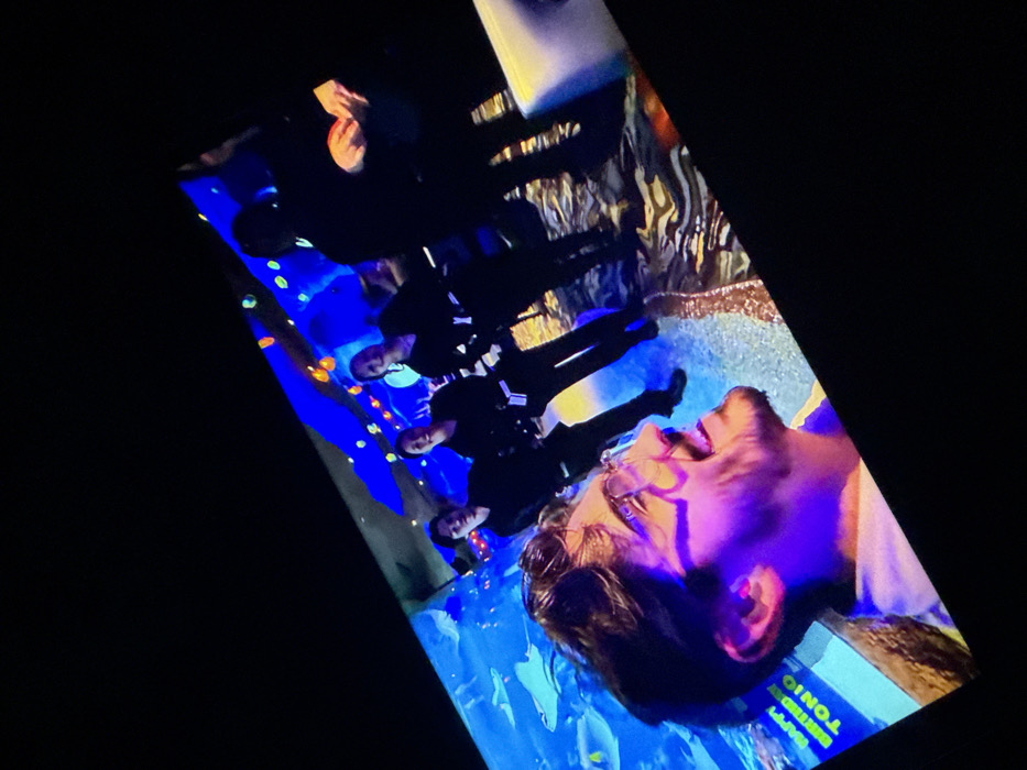 The scene depicts an interior view of The Fishbone restaurant in Sofia, Bulgaria, characterized by an aquatic theme under artificial blue and purple lighting. In the foreground, a male individual with dark hair, a beard, and eyeglasses is positioned in profile, facing right and smiling broadly; his face is highlighted with purple and orange illumination. Behind him, a large aquarium wall displays various fish, including several rays, and features a yellow-text inscription reading "HAPPY BIRTHDAY TONIO." In the mid-ground, four individuals, likely staff members in black uniforms, stand observing towards the foreground. The person on the far right holds a small, spherical red object. Overhead, blue light fixtures are interspersed with colorful luminous dots. The floor exhibits a textured pattern resembling a shallow waterbed.
