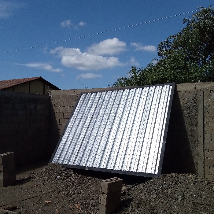 The image depicts an outdoor scene in Juan Griego, Venezuela, characterized by a construction or storage area under a clear blue sky. A large, rectangular panel, approximately 2 meters wide by 1.5 meters high, made of corrugated galvanized metal sheets encased in a black frame, leans at an approximate 60-degree angle against an unrendered concrete block wall. The ground in the foreground consists of loose, dark brown soil mixed with gravel and debris. Two hollow grey concrete blocks are positioned vertically on this uneven surface. The scene is enclosed by rough concrete block walls. Above the walls, a clear blue sky with scattered white cumulus clouds is visible, traversed horizontally by a thin utility line. To the left, a section of a building with a reddish-brown tiled roof and a light-colored wall is present. To the right, dense green tree foliage rises above the wall. No individuals are depicted.