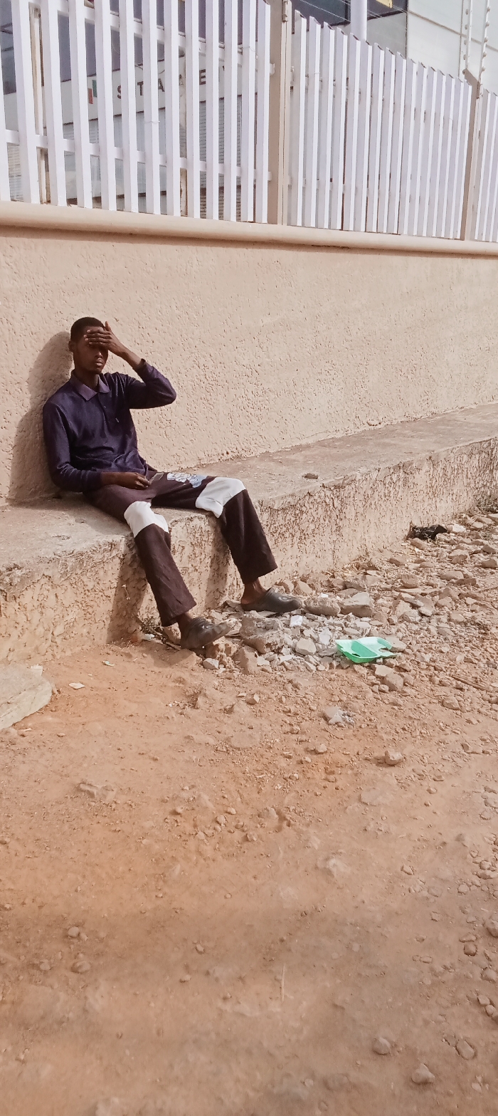 In Kabala, Nigeria, a lone male individual is seated on a concrete ledge next to a textured, light beige wall. He is wearing a long-sleeved dark blue polo shirt and dark trousers with white patches on the knees. His right hand is placed across his forehead, shielding his eyes. He is wearing dark slip-on shoes. The ground in front of the ledge is unpaved, consisting of reddish-brown dirt mixed with gravel and various debris, including a small green plastic item near his feet. In the background, behind the concrete wall, a white slatted fence is visible, beyond which parts of a building with glass windows and a sign bearing the partially visible capital letters "STA E" can be discerned. The scene is illuminated by bright daylight, casting distinct shadows.