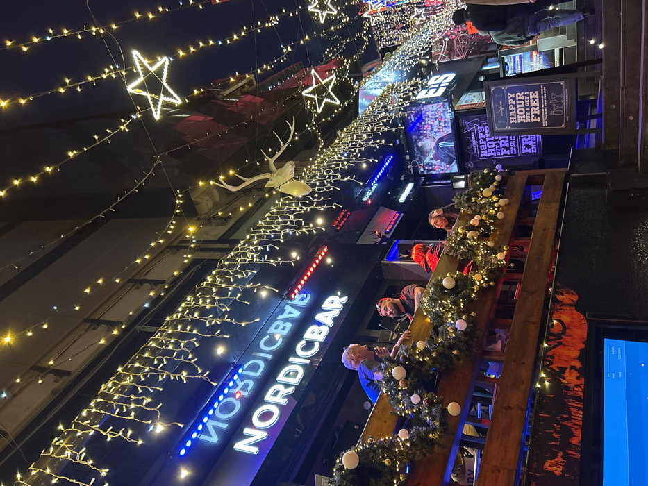 The image displays a nighttime street scene in Paceville, Saint Julian's, Malta, focused on the entrance of the "NORDICBAR" establishment. The bar's facade features an illuminated sign with "NORDICBAR" in white capital letters on a dark background, flanked by horizontal blue and red LED strips. Above the sign and across the street, numerous warm yellow LED string lights are strung, some in an icicle pattern, along with several illuminated five-pointed star ornaments. A white, stylized deer head with antlers is mounted on the building facade to the right of the bar's sign. On the second-story balcony of "NORDICBAR," a wooden railing is decorated with evergreen garlands, white spherical ornaments, and additional string lights. Four individuals are positioned along this railing. On the left, an older male with short grey hair and a dark shirt leans over the railing. Next to him, a bearded male with a red headband and a dark t-shirt leans against the railing. To their right, a female with red hair and a red top, and another female with dark hair, also lean against the railing. Below the balcony, to the right, a large digital screen displays a sporting event. Adjacent to this screen, a blackboard-style sign advertises "HAPPY HOUR FRI & SAT BUY 1 GET 1 FREE," with a similar freestanding sign on the ground below it. To the far right, a set of dark stairs descends, where two figures are partially visible walking downwards, one in a dark jacket and jeans viewed from behind. Another screen showing a different image is visible on the far left, partially obscured. The scene is illuminated by the numerous decorative and commercial lights.