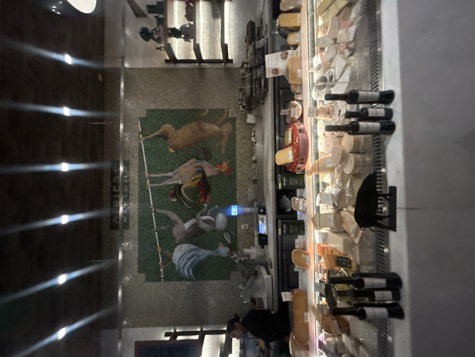 A shop features a cheese and wine display case against a wall adorned with mosaic animal artwork. An employee stands nearby. The mosaic depicts a rooster, a grey bird, and a deer on a green background. The display case is filled with various cheeses, wines, and other deli items. Lighting fixtures are visible on the left side of the image, creating streaks of light.