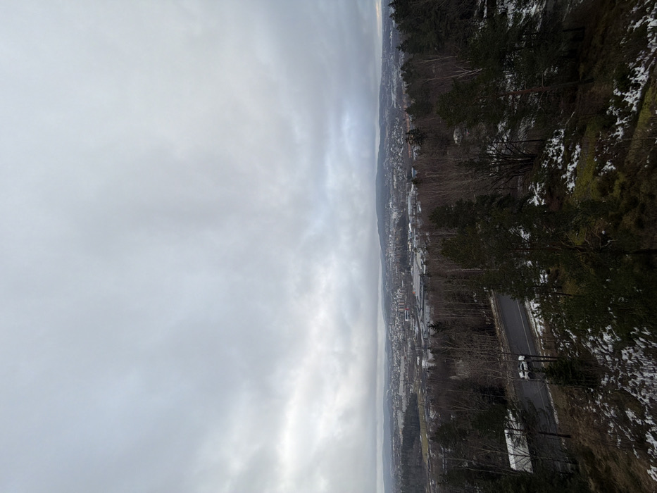 The image presents an elevated, panoramic view of Oslo, Norway, under a uniformly overcast, grey sky. In the foreground, a hilly landscape is dominated by dense forestation, comprising dark green coniferous trees (pines, spruces) and bare deciduous trees. Patches of sparse white snow are visible on the brown earth and green moss covering the terrain, suggesting a cold season. A two-lane asphalt road winds through the lower-left section of this wooded area. On the road, a white cargo van is partially visible on the left, facing right. A lighter-colored SUV is positioned further right on the road, and a dark-colored vehicle is partially discernible behind it. No people are visible. The mid-ground reveals a transition from forest to a mixed urban and commercial area. Several large, flat-roofed industrial or commercial buildings, including one with a distinct blue roof section, are interspersed with smaller structures and open ground. Beyond this, the background displays a sprawling cityscape of Oslo, characterized by numerous multi-story residential and commercial buildings extending towards the horizon. Distant hills or mountains, partially obscured by atmospheric haze or low clouds, form the far backdrop of the scene.