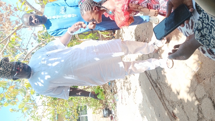 An outdoor scene in Kuru, Nigeria, depicts four individuals under direct sunlight, casting distinct shadows on the sandy and dirt ground. A man in a white agbada-style outfit, a leopard-print cap, dark sunglasses, and a white wristwatch stands centrally, holding a cluster of green, unripe plantain or banana-like fruits in his left hand. His gaze is directed downwards. To his right and slightly behind him, a younger man in a light blue embroidered traditional garment gently touches the top of a young girl's head or hair with his right hand. The girl, wearing a red ruffled off-shoulder top, a patterned dress, and a light blue necklace, looks upwards towards the younger man. In the lower foreground, a person's hands are visible, one holding a black smartphone with a reflective screen, the other open-palmed, resting on a patterned fabric. Sparse green foliage, a distant building, and scattered debris are present in the background.