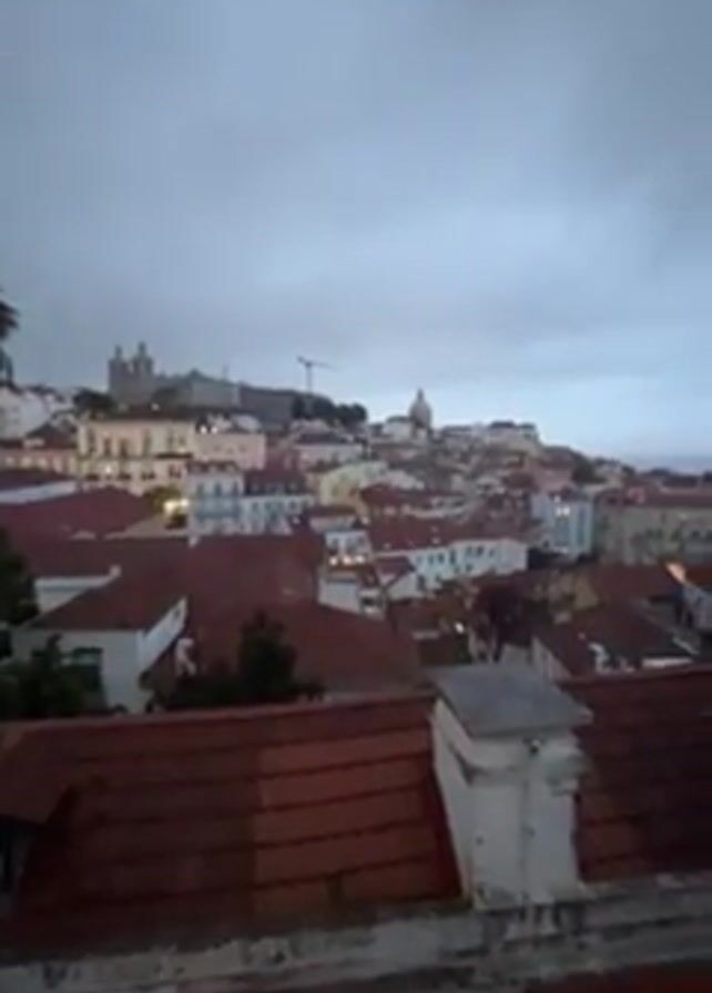 view of a city with many red-tiled roofs. The sky is overcast. There are several buildings, a castle-like structure, and a crane in the distance. The city appears to be situated near the ocean, as a body of water is visible in the background. The video is taken from an elevated position, looking out over the rooftops. There is a palm tree visible on the left. The city lights are on, indicating it is either dusk or night.