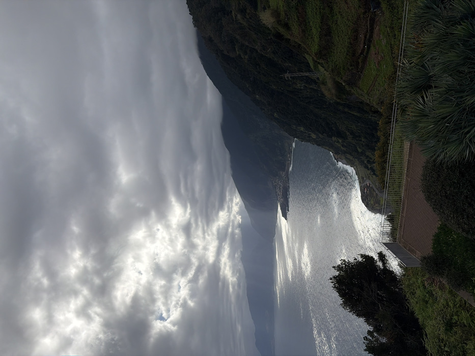 The image displays a panoramic coastal scene near Porto Moniz, Portugal, observed under a heavily overcast sky. The upper frame is dominated by dense, grey clouds, with bright, illuminated sections in the left-center where sunbeams distinctly break through and project onto the ocean surface. The Atlantic Ocean occupies the central and lower-left, exhibiting a choppy texture with pronounced sun glints creating shimmering streaks across the water. A rugged coastline stretches into the distance, featuring a small coastal settlement characterized by a cluster of buildings visible along the shore in the mid-ground on the left. The right side of the image is defined by steep, dark green, forested cliffs and mountains that descend sharply to the sea. Agricultural terraces are visible on the lower slopes of these mountains, and a utility pole with associated lines is present on the hillside. A winding road can be seen tracing the coastline in the lower mid-ground. The immediate foreground features a concrete viewing platform enclosed by a light-colored metal railing, partially obscured by dense green foliage, including a dark coniferous tree on the left and palm-like vegetation on the right. No individuals or specific actions are depicted.