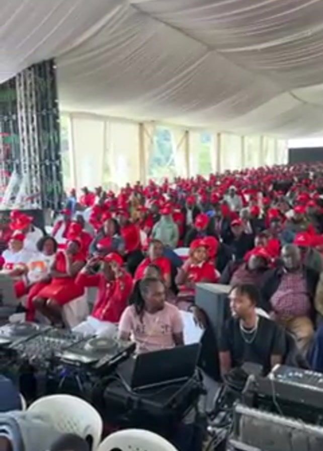 A large gathering of people, primarily dressed in red, is seated under a white tent. Many are wearing red hats. The camera pans across the audience, showing various individuals, including some men in suits. In the foreground, there are two DJs working with audio equipment and laptops. The setting appears to be an outdoor event or a political rally.