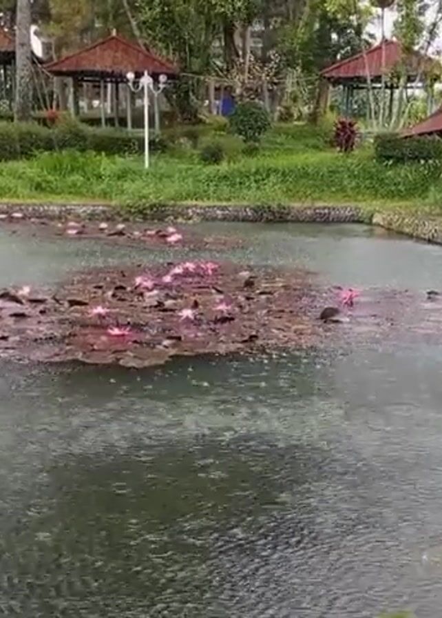 The scene is a still shot of a pond with pink water lilies in full bloom, clustered together in the center. The water is rippled, indicating rainfall. Around the pond, there are four green wooden shelters with red roofs, two on each side. The pond is bordered by stones. Behind the pond, there is a grassy area and some trees, as well as a white building in the background. The lighting suggests an overcast day.