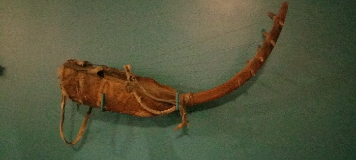 - "The image displays an aged, traditional stringed musical instrument, likely a bow lute or harp, suspended horizontally against a solid teal-colored wall" by FM-E70Zl1, licensed under CC BY 4.0