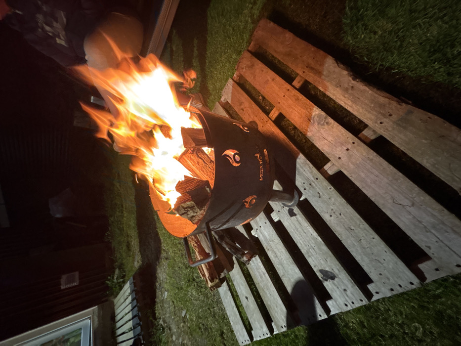A fire pit overflows with a vibrant fire, situated on a wooden pallet on a grassy lawn. The fire pit is black with decorative cutouts. Additional pieces of wood are stacked next to the fire pit. The scene is likely at night with dark shadows cast across the grass and pallet. Part of a house with a window is visible in the lower left corner. The lighting emphasizes the flames and the objects immediately surrounding the fire.