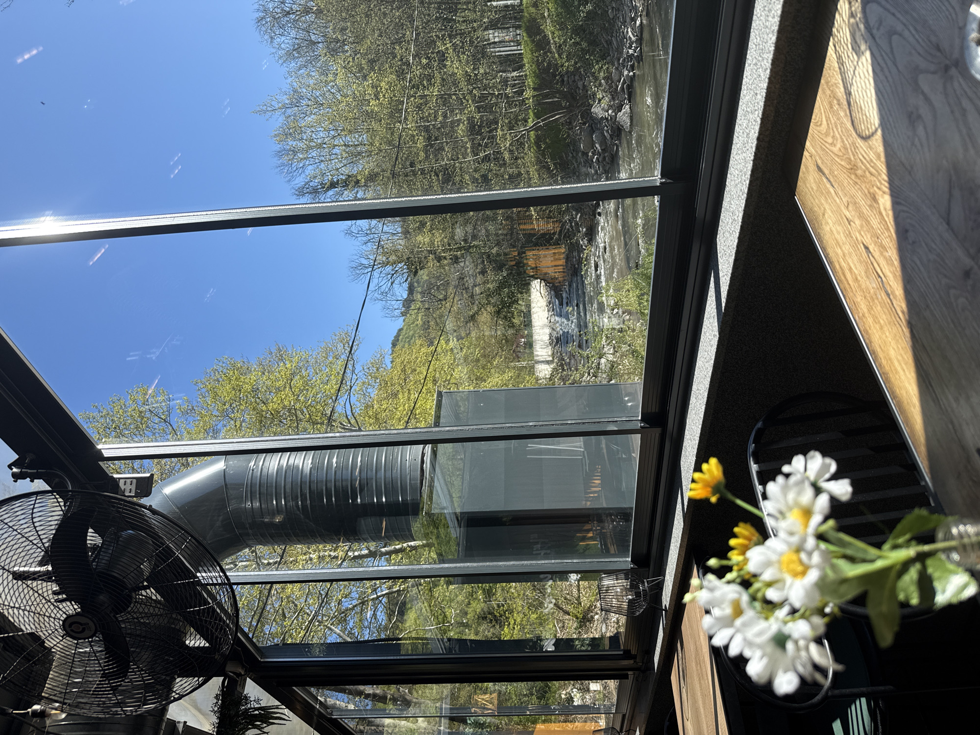 The image depicts an interior view through a glass ceiling or skylight, reflecting an outdoor scene. A fan and ductwork are visible within the interior space. Outside, trees, a stream or river, and what appears to be a small dam or waterfall can be seen. Based on the reflection, the landscape suggests a natural environment, possibly near a body of water. The location is Marchevo, Bulgaria. A vase of white and yellow daisies sits on a table to the right side of the image.