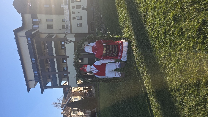 A daytime, eye-level outdoor scene in Tryavna, Bulgaria, depicts two large, stylized anthropomorphic figures standing on a manicured green lawn. The figures are positioned beneath a green, leafy archway. The figure on the left, representing a male, wears a red vest over a white shirt, white trousers, and a red cap, adorned with traditional Bulgarian elements. The figure on the right, representing a female, is dressed in a red traditional Bulgarian dress with a dark apron and a white head covering. In the background, a substantial multi-story building features light-colored walls, multiple windows, and balconies with dark wooden railings. Decorative icicle-style string lights are visible hanging from some balcony edges. To the far left, a smaller, older building with a dark roof is partially visible, alongside a tall, conical evergreen tree. A black, ornate streetlight stands to the right of the figures, near the main building. The sky above is clear blue, and bright sunlight casts distinct, elongated shadows across the grass, indicating a clear, sunny day.