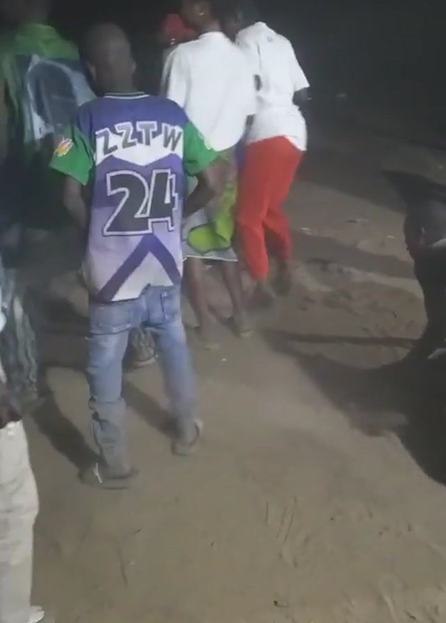 group of people dancing outdoors at night. The ground appears to be dirt or sand. Individuals wear various clothing, including t-shirts, jeans, and dresses with colorful patterns. Some are facing the camera, while others have their backs turned. One person is dressed in red pants and a white shirt, and another in a green shirt with a design on the back and light blue jeans. A man on the side of the frame appears to be holding a cigarette. The lighting is dim, creating deep shadows.