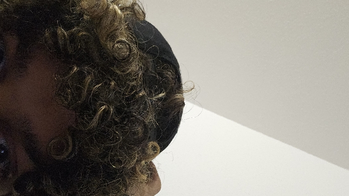 A close-up, low-angle shot focuses on a person's head and shoulders against a white wall. The person has dark, curly hair with some strands appearing lighter, almost golden. A black cap partially covers the hair. The person's eye is visible in the lower-left corner, with part of their beard, and an ear is slightly visible behind the hair. The white wall provides a stark contrast to the dark hair and cap.