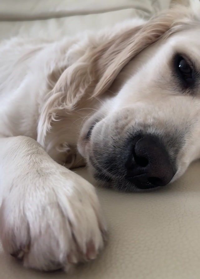 A close-up video shows a light-colored Golden Retriever lying on a light-colored couch
