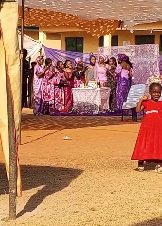 group of women standing around a table at an outdoor event, possibly a wedding. The women are dressed in a variety of colorful, formal wear, primarily in shades of purple and pink. They appear to be celebrating, clapping and interacting with each other. There's a white-covered table in front of them with bottles on top. Behind the women, there's a backdrop decorated with flowers and shimmering material. The event takes place under a large tent with a speckled pattern. A small girl in a red dress stands in the foreground, facing the camera. The ground is covered in a light-colored material, possibly sand. A support pole of the tent is visible on the left side of the frame, casting a shadow.
