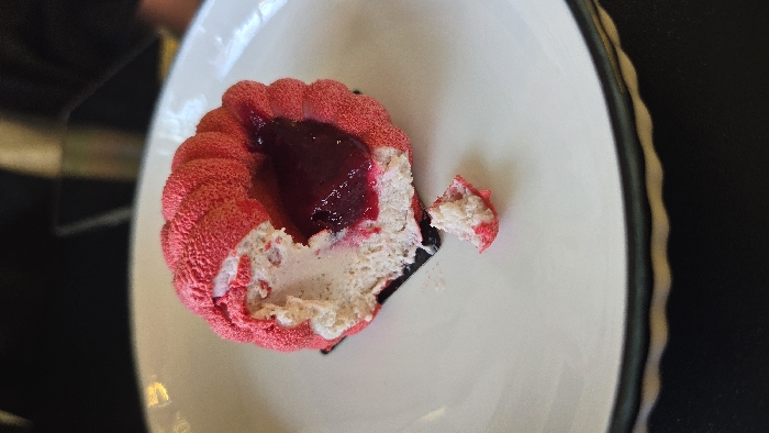 The scene depicts a partially consumed individual dessert, situated on a white round ceramic plate with a dark, scalloped rim. The dessert features a vibrant pink, textured, velour-like exterior, with a rounded, fluted shape. A section has been removed from the front of the dessert, revealing its interior composition: a light-colored mousse layer encasing a central core of dark red, glossy fruit compote or gelée. A small, irregularly shaped piece of the dessert, matching the exterior and light interior, lies detached on the plate directly in front of the main item. The background is dark and out of focus, indicating an indoor setting, likely a cafe or restaurant environment, illuminated by ambient light. No individuals or specific actions are visible beyond the implied consumption of the dessert. The scene is situated in Stara Zagora, Bulgaria.