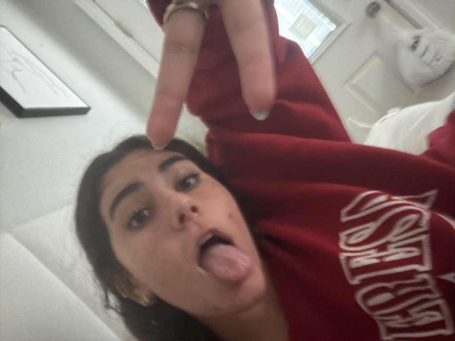 A selfie captures a woman with dark hair and brown eyes, sticking her tongue out playfully. She's wearing a red sweatshirt with white lettering, the word "EAST" is visible, with her hand in a peace sign in the frame. A silver ring adorns her finger. The background includes a framed picture on a white wall and a window with a white frame. A white shopping bag hangs near a white door. The photo's angle is slightly skewed, giving a casual, candid feel.