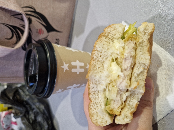 An indoor scene in Bahovitsa, Bulgaria, features a hand holding a half-eaten sandwich over a white paper napkin on a light gray countertop. The sandwich consists of a split round bun containing a breaded patty, white sauce, and shredded green lettuce. In the mid-ground, a beige disposable coffee cup with a black plastic lid is positioned to the right of the sandwich. The cup is adorned with white "H" logos and stars. Behind the coffee cup, a light-colored bag displays a black graphic outline of a woman's head with styled hair and red lips. To the left of the coffee cup, a crumpled black plastic bag is visible, with blurred yellow objects in the far background.