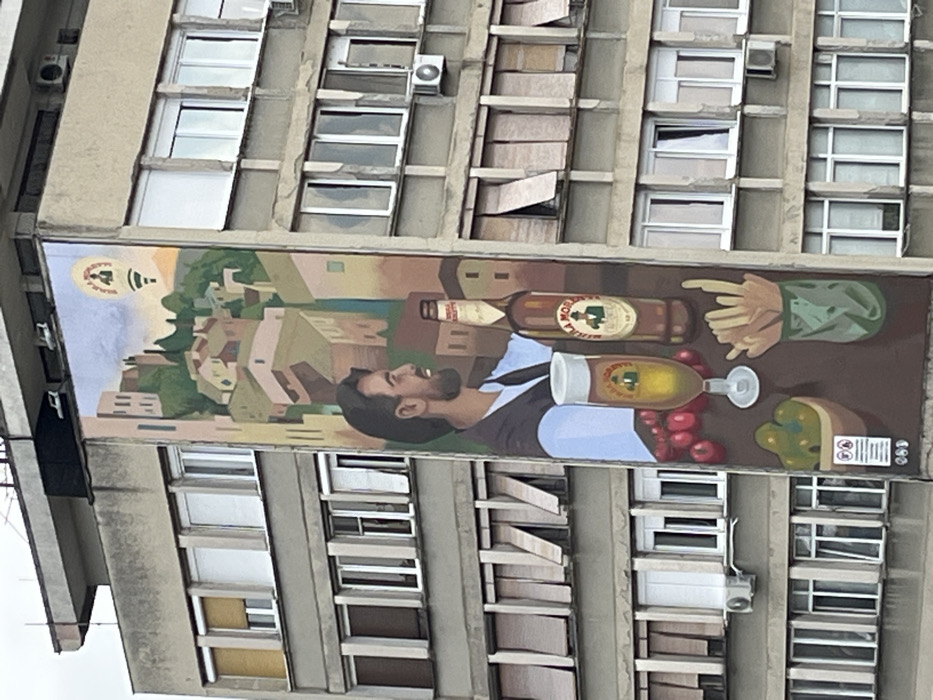 This image depicts a multi-story concrete building located in Belgrade, Serbia, under an overcast sky. The building facade features numerous recessed windows with white frames; some are open, some are closed, and many are fitted with external blinds, several of which are partially open. Multiple external air conditioning units are mounted below windows on the right side of the structure. A large, vertically oriented mural, rendered in a cartoonish style, occupies a central section of the building's facade. The top portion of the mural illustrates a stylized hillside town with various houses and buildings under a sky transitioning from light blue to orange. A hot air balloon with a circular logo is depicted ascending in the upper right quadrant of the mural. Below this cityscape, a smiling man with dark hair and a beard, wearing a light blue shirt and dark vest, is shown looking towards the right. To his right, a brown glass beer bottle labeled "BIRRA MORETTI" stands. Next to the bottle, a stemmed glass containing golden liquid, also branded with the "BIRRA MORETTI" logo, is visible. The lower section of the mural displays a pile of red cherries, a wooden bowl filled with green olives, and a green container holding French fries. At the very bottom, white warning signs on a dark background indicate "no smoking," "no alcohol to minors," and "no littering," accompanied by a QR code and the digits "063."