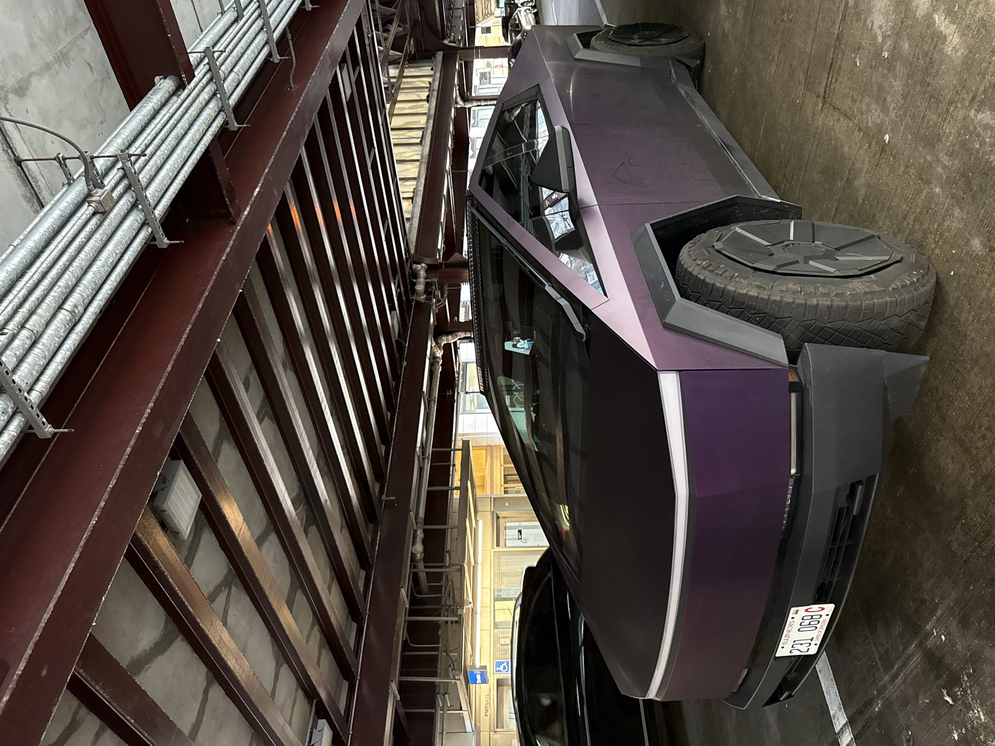 The image captures a purple Tesla Cybertruck parked in what appears to be a parking garage or alleyway in Chicago, United States of America. The vehicle is prominently featured, with a clear view of its unique angular design and one of its tires. The license plate is visible. To the left, there is a metallic structure with pipes and beams. The surrounding environment includes the concrete floor and other structural elements. The image's orientation is somewhat tilted, presenting a slightly unconventional perspective of the scene.