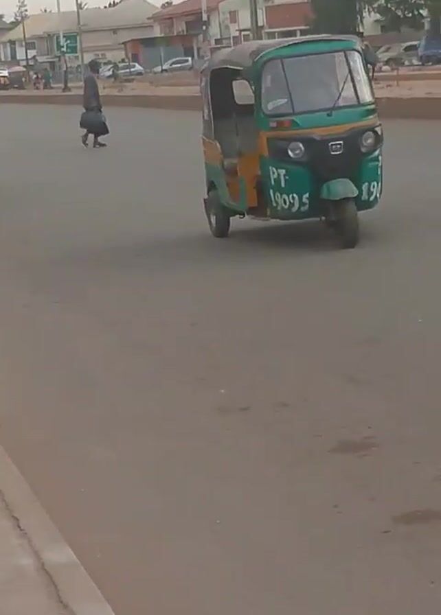 wide road in what appears to be a town or city. The weather is overcast. A green and yellow tuk-tuk, or auto rickshaw, drives towards the camera and then veers off screen. A person carrying a dark bag walks across the road from right to left and steps onto a raised curb or sidewalk. Several other tuk-tuks, cars, and people can be seen in the background along with buildings and trees. Utility poles are visible above the buildings.