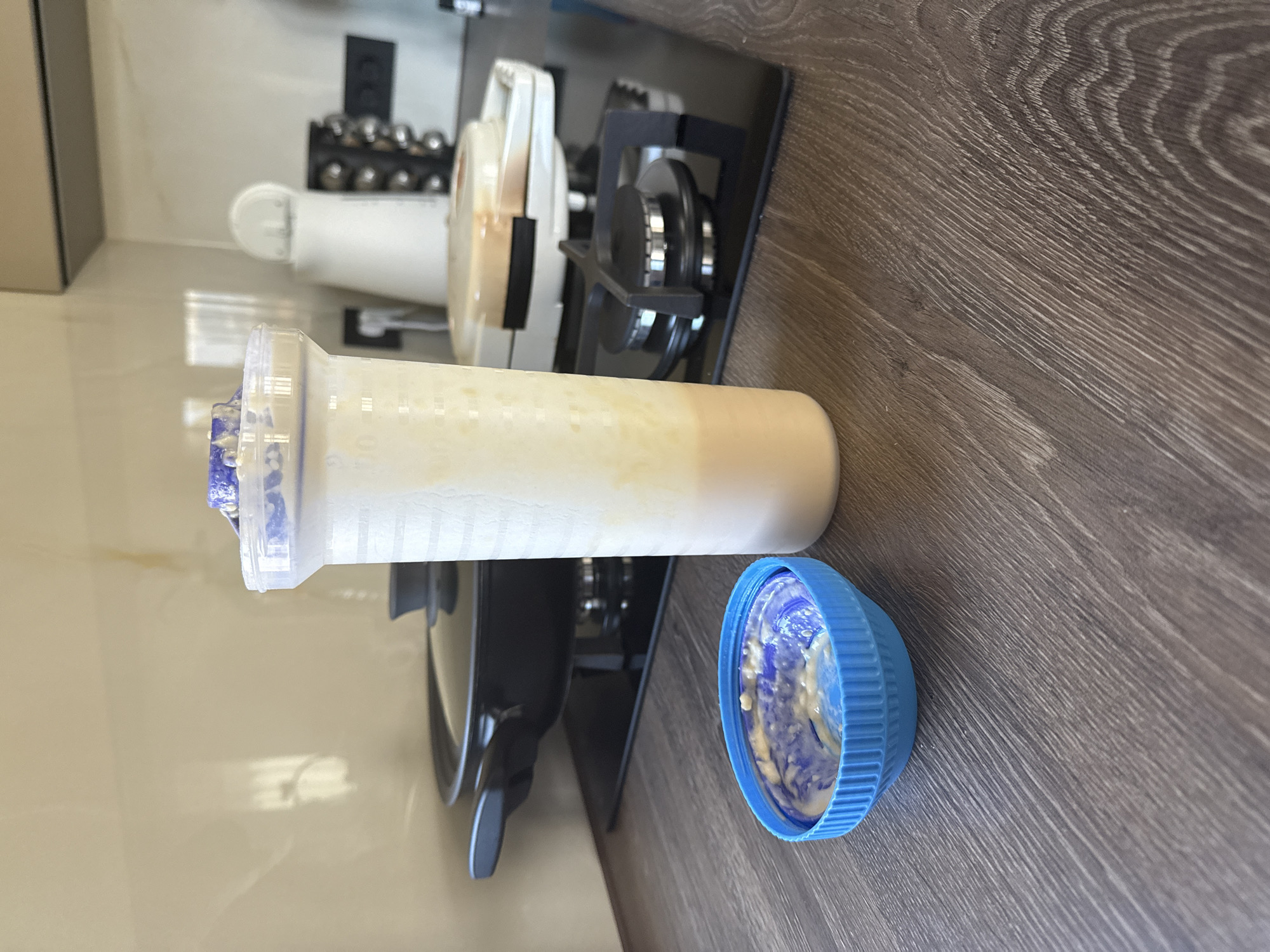 The image depicts a countertop scene. A cylindrical container with a clear, ridged upper section and an opaque, layered beige and white liquid inside lies horizontally. The open blue lid of the container rests nearby, revealing a residue of the same beige and white substance. Behind the container, a black stovetop with burners is visible, along with a white appliance of unknown function. The countertop has a dark brown, wood-grain surface. The location is unknown.
