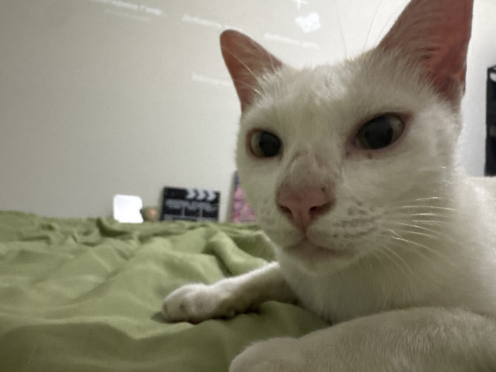 - "In Cam Đức, Vietnam, a white domestic cat with a pink nose and light-colored irises is positioned on a wrinkled green fabric surface, facing and looking directly at the camera" by FM-Oi8nu1, licensed under CC BY 4.0