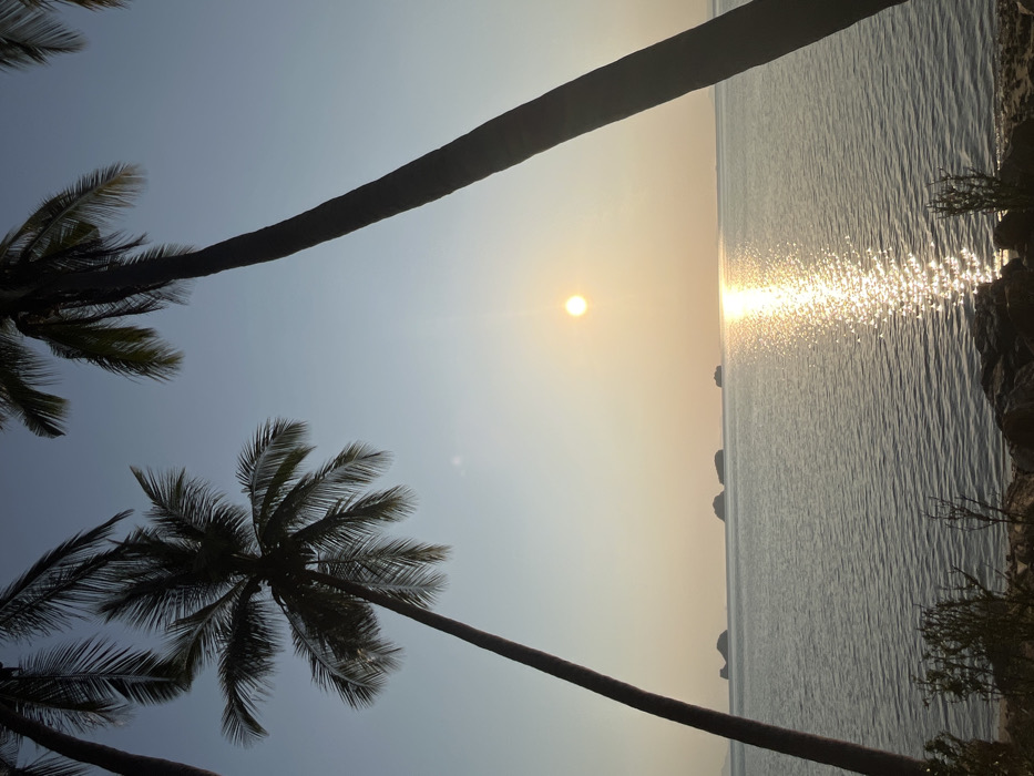 The image depicts a coastal scene at Baan Taling Ngam, Thailand, during what appears to be a sunset or sunrise. The horizon separates a clear, light blue sky, which transitions to a warm orange-yellow near the sun, from a calm body of water. A prominent, bright yellow-orange sun is positioned above the horizon, slightly to the right of the image center, casting a distinct, shimmering vertical reflection across the water surface towards the foreground. Four dark, low-lying landmasses or islands are visible on the distant horizon. The scene is framed by two tall, slender palm trees silhouetted against the sky; one leans from the left side towards the center, displaying prominent fronds, while a second tree trunk is partially visible on the far right, with fronds entering from the top right. The immediate foreground consists of dark rocks and sparse, low-lying vegetation at the water's edge. No individuals, animals, or specific actions are discernible within the frame.