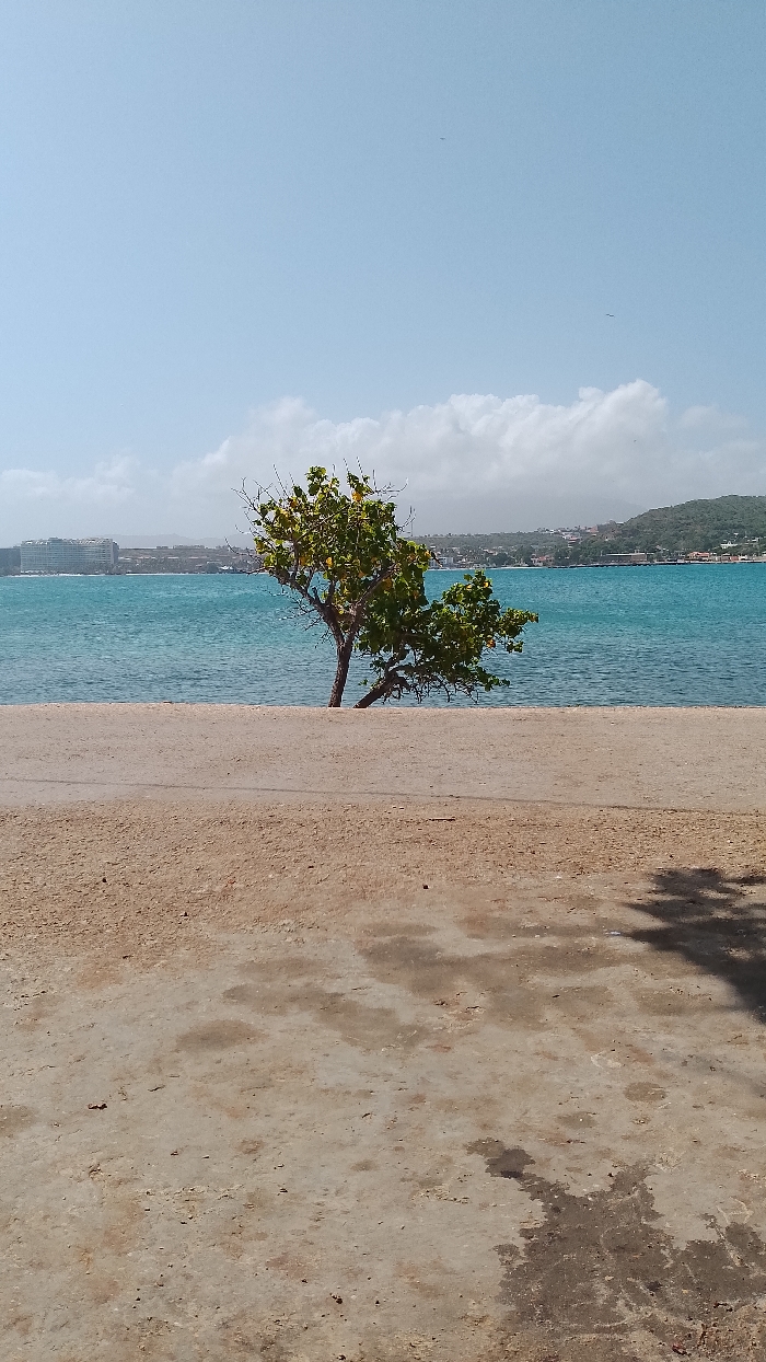 The image presents a sunlit coastal landscape in Pampatar, Venezuela. The foreground consists of an irregular, unpaved ground surface, displaying shades of light brown and gray, with darker stains and shadows visible on the right. A lighter-colored, paved strip or seawall horizontally bisects the lower third of the frame, serving as a boundary between the foreground ground and the water. Centrally, a single deciduous tree with green foliage and dark, exposed branches grows from the edge of this paved strip, leaning slightly over the turquoise-blue water, which exhibits subtle ripples. The background features a distant cityscape along the left coast, comprising multiple buildings, some of which are multi-story structures. Towards the right, green hills with scattered buildings extend to the horizon. The sky overhead is clear and light blue, with a band of white, fluffy clouds situated above the distant landmasses. Small, dark specks, likely birds, are visible in the upper sky. No individuals or specific activities are present within the scene.